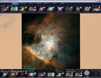 WorldWide Telescopeの画面は、天体観測データの表示面、操作ボタン、メニューで構成されています。起動直後は太陽系から銀河系中央を見た画像が表示され、画面下部には太陽系の惑星が描かれたボタンが並びます。上部には観測衛星が撮影した画像や、星座の解説、ガイドツアーなどを選択するボタンが並びます。どのボタンからでも、惑星や恒星、星座などを観測した最先端の画像を、科学雑誌に掲載されているような美しいグラフィックで見ることができます。